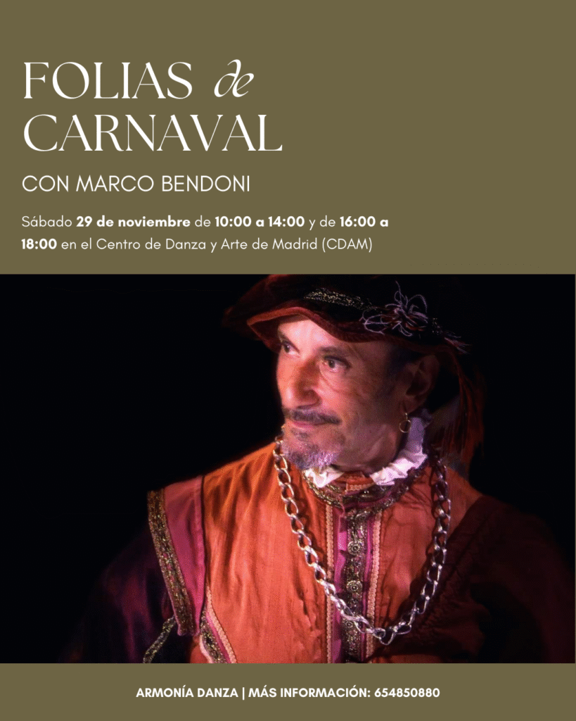 |FOLIAS DE CARNAVAL| Armonía Danza ofrece un curso preparatorio a nuestro espectáculo de de máscaras, “Folía Barroca”, como experiencia inmersiva a las fiestas con máscaras que tuvieron lugar en los siglos XVI y XVII, y que nacieron como entretenimiento de nobles y cortesanos. Estudiaremos  coreografías como bourré o la giga, más próximas al barroco.